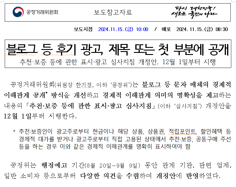 블로그를 하고 계시는 분들께서 꼭 알고 계셔야 하는 내용이 있습니다. 11월 15일, 공정거래위원회(위원장 한기정, 이하 ‘공정위’)는 블로그 및 문자 중심 매체에서의 경제적 이해관계 공개 방식을 개선하고, 그 의미의 명확성을 높이기 위한「추천·보증 등에 관한 표시·광고 심사지침」(이하 ‘심사지침’) 개정안을 발표했습니다.