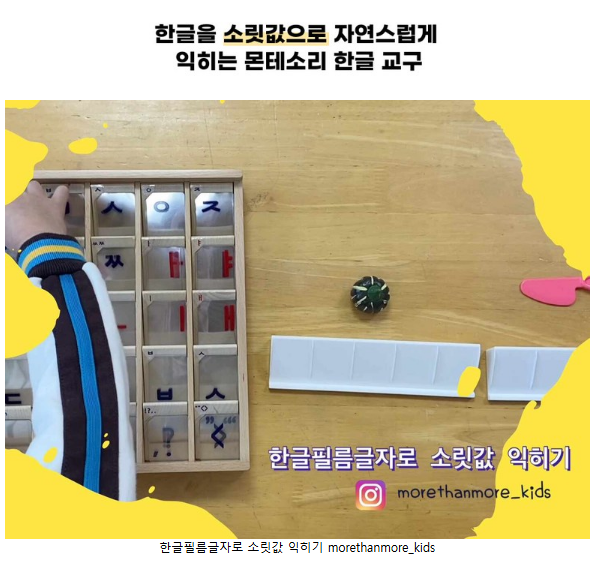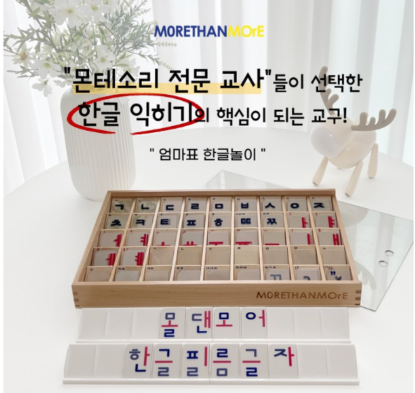 여러 교구들과 교재를 찾다가 몰댄모어 한글필름글자를 알게 되었고 자음과 모음이 색깔로 구별도 되어 아이가 인식하기도 좋았습니다.